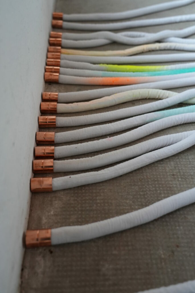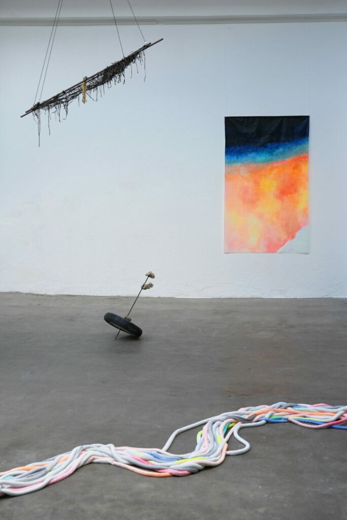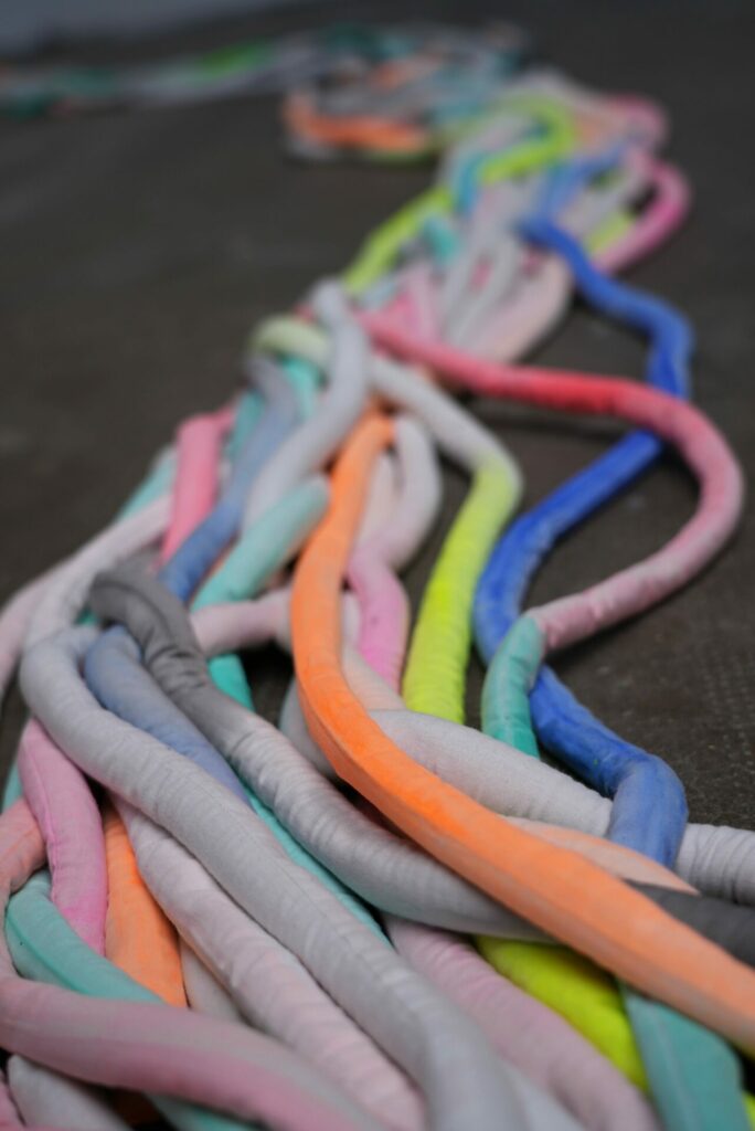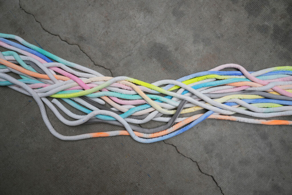 Le regard est attiré par un réseau de câbles colorés et acidulés qui traversent l’espace.