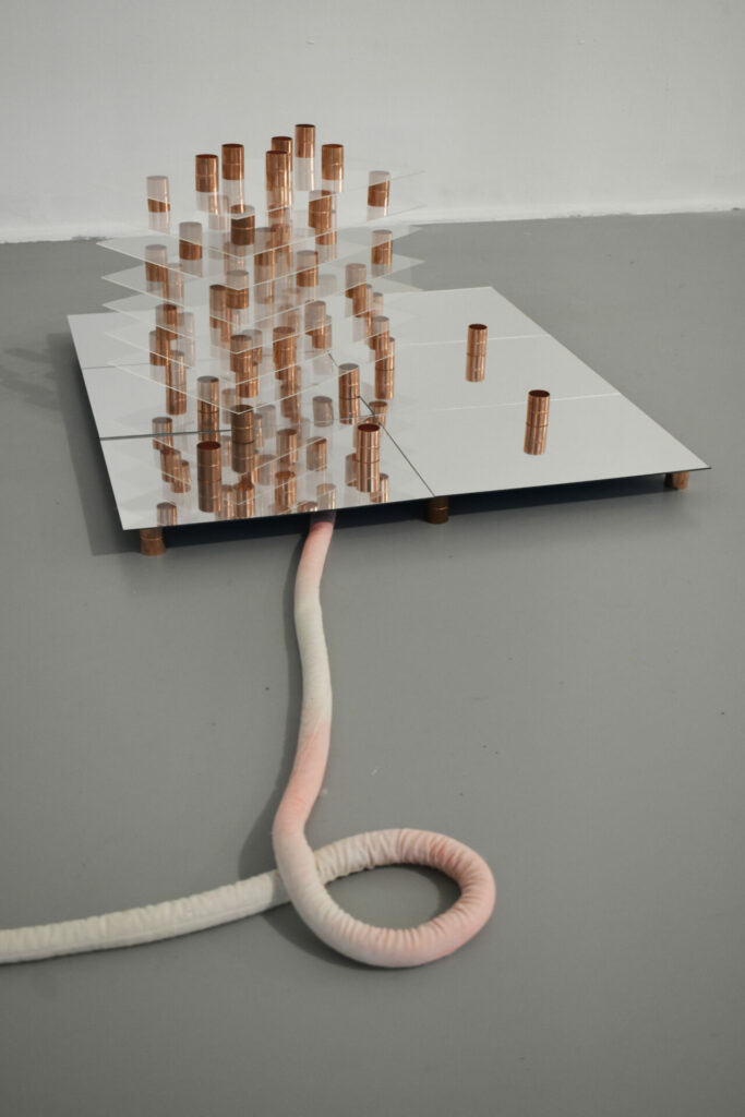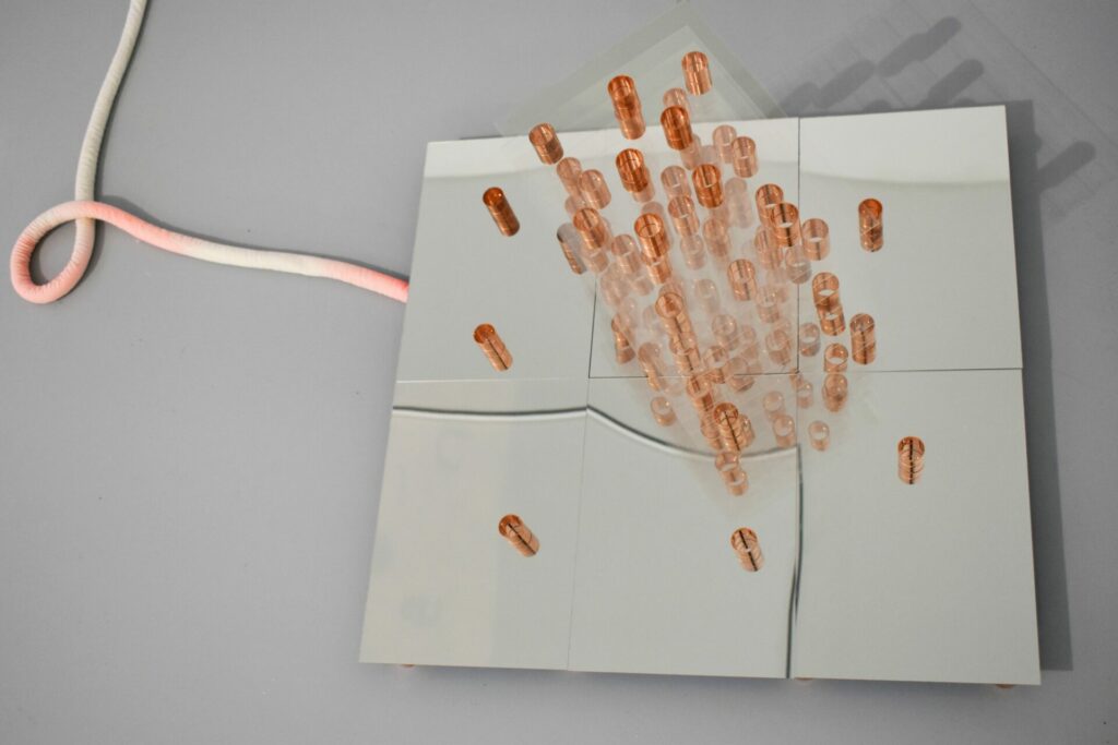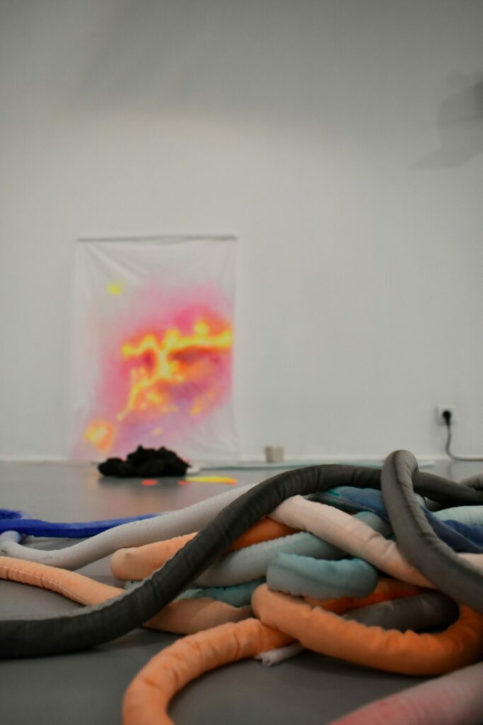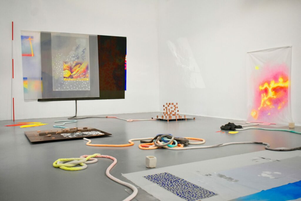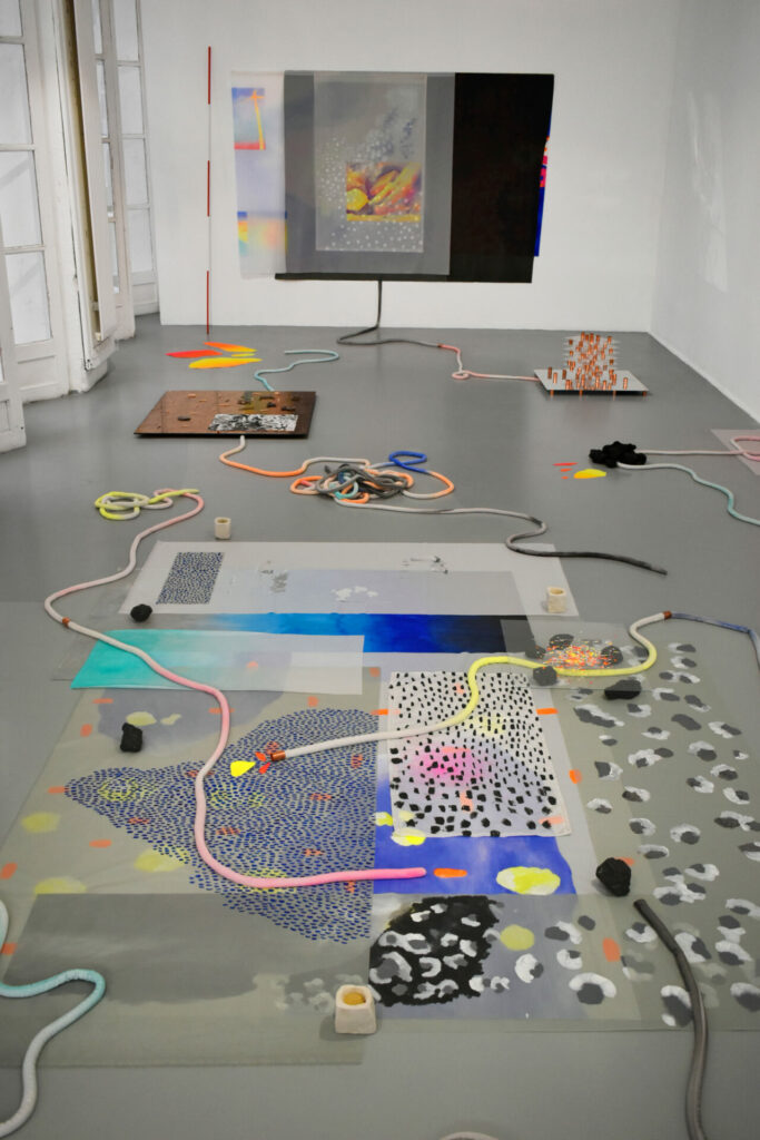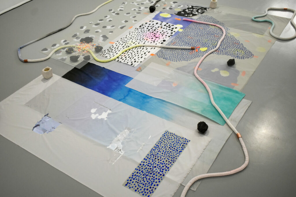 Ces différents régimes de perceptions et de sensations s’agencent par superposition et confrontation pour créer une cartographie à entrées multiples. Des liens organiques se tissent entre les différentes plateformes, dont les frontières poreuses, parfois non délimitées clairement, permettent une circulation des matières, des lignes et des motifs et des peintures réalisées à partir de relevés thermiques photographiques ou de matières argileuses, cuites de différentes manières ( cuisson primitive/ cuisson four).
